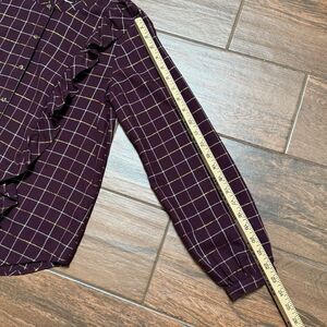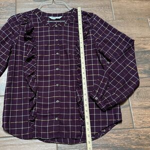 Sonoma Ruffled Flannel Top Womens S Maroon Plaid Button Up Shirt Blouse Small
