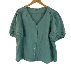 Sonoma Sage Green Button Up Blouse XL V Neck Pleated Shoulder Balloon Sleeve Top