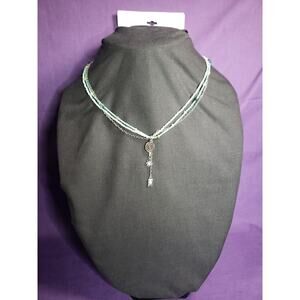 This is a beautiful necklace by Sonoma. It has three layers with some semiprecious stones in green, some green and some light mint green seed beads, some tan colored heishi style beads, and a silver tone chain. It has a tassel of three different charms on the front with one round textured disc, one star with a clear rhinestone accent, and one rectangle with a clear rhinestone accent. The listing says it adjusts from 15.5-17.5 inches in length, but I can't verify that without opening the package. This item is new in the original package, originally $26.