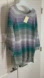 Striped shaker stitch 3/4 sleeve sweater by Sonoma. High low hem, round neckline, metallic threads throughout. Style ST422013S. Color “Earl Grey” purple, teal, grey. Cable knit bands at neck, cuff and hem. Slit at sides. Meas approx: Shoulder to hem 28” front, 31” back, armpit to armpit 22”, sleeve 21”. Size XL. Soft acrylic blend. Extra yarn included. Smoke free and pet free environment. Condition: New with tags.