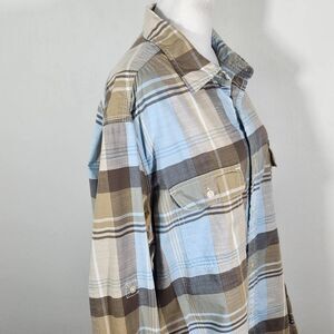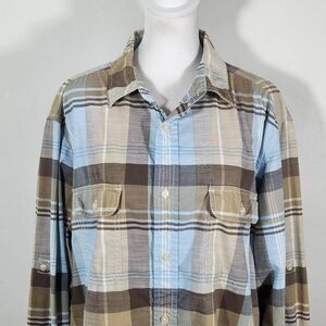 Sonoma Tan and Blue Plaid Button-Down Shirt Size Large Comfy Plaid Button-Up Top