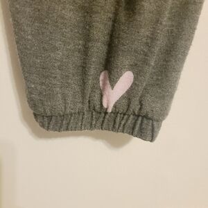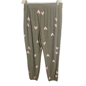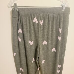 Fill your life with love! Women's gray fleece pajama joggers by Sonoma, size large. Pajama pants have pink hearts printed allover for a flirty look. Cozy joggers have a fabric blend of rayon, polyester and spandex. Excellent pre-owned condition; no flaws.
