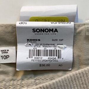 These Sonoma shorts are NWT and in great condition. Size 10P. Lightweight cotton fabric and comfort soft waistband. 2 front, 2 back and 1 side pocket. Waist, 16''; inseam, 17''. The legs can be adjusted to make them longer or shorter.