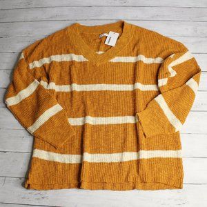 This pullover sweater is a pumpkin gold color with ivory stripes. It is light to medium weight with slight open weave with nubby texture. It is roomy and is generous in sizing. It's a beautiful sweater and is brand new with tags.