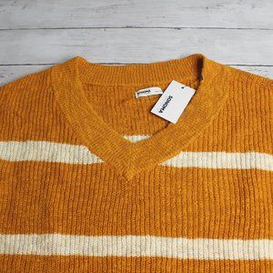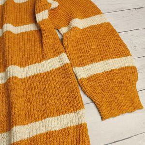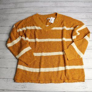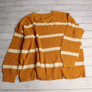 This pullover sweater is a pumpkin gold color with ivory stripes. It is light to medium weight with slight open weave with nubby texture. It is roomy and is generous in sizing. It's a beautiful sweater and is brand new with tags.