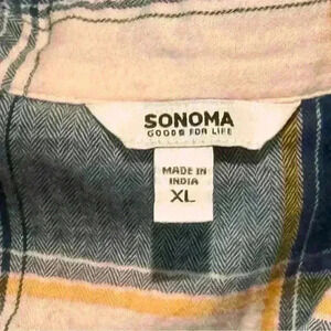 Elevate your casual wardrobe with this Sonoma plaid button-up shirt in a vibrant multicolor design. Crafted for comfort, this long-sleeve shirt offers a regular fit, perfect for those crisp days. The button-down collar and collared neckline add a touch of classic style, making it an ideal choice for casual outings, weekend gatherings, or a relaxed day at the office. With its versatile appeal, this shirt effortlessly transitions from day to night. Pre-owned and in great condition, ready to become a staple in your collection.