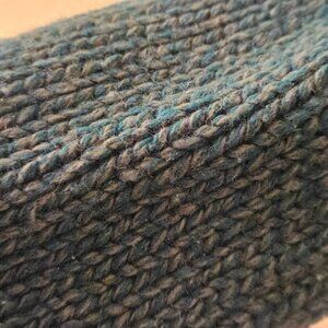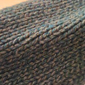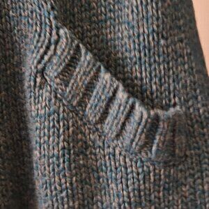 This sweater is soft and cinches in at the waist. There are two pockets in the front and the color is like a teal blue. It is part wool and part acrylic. It is a marled bluish beige.