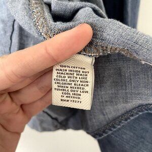 A light wash blue denim button down jean jacket. Made with 100% cotton. Labeled a women's size petite large.