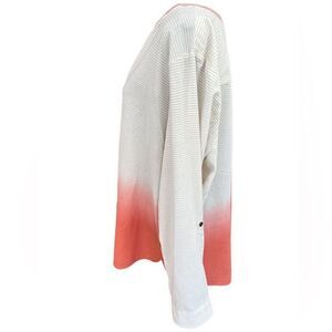 Sonoma split neckline ombré tunic with tab sleeves size 2X. Ivory background with small black stripes, embroidered details on neckline and bodice, fades to shades orange at bottom. Tab sleeves with buttons, button cuffs. 100% cotton. Approximate measurements are pit to pit 28.5”, length from shoulder approximately 27-30”, longer in back with rounded hem.