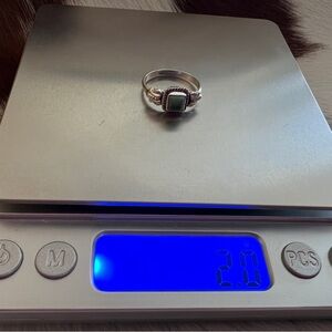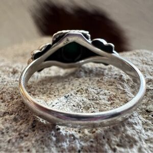 For your consideration is this sterling silver ring featuring Sonoran Gold turquoise, marked "925". The ring showcases a rectangular, greenish-blue turquoise stone set in a plain bezel with a twisted rope border. The stone exhibits natural matrix variations, typical of Sonoran turquoise which can have both green and blue colorings. The band of the ring is made of sterling silver and features decorative leaf-like or abstract stamped designs on the shoulders, adding a Southwestern or Native American aesthetic to the piece. The ring is size 6.5 and weighs approximately 2 grams.