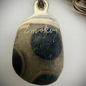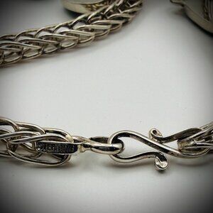 Gorgeous Sonoran Gold turquoise set in sterling. Nine free-form stones hang from a heavy woven sterling chain; matching dangle earrings complete the set. Necklace clasp stamped STERLING; pendant back scratch-signed “Smokey” (artist not verified). All pieces test sterling.