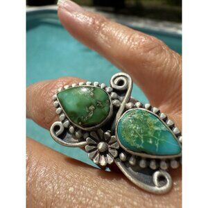 This Sonoran Gold adjustable Turquoise Ring is a striking statement piece. The cluster design, set in 925 sterling silver, highlights the vibrant hues of the turquoise stones, perfect for elevating any ensemble with a touch of elegance. Its unique craftsmanship showcases the beauty of natural materials.