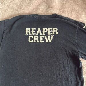 This black long sleeve tee features striking white graphics on the front and sleeves, offering a bold contrast against the dark fabric. Made from a comfortable cotton blend, it's perfect for casual outings and showcases a unique circular text design reminiscent of motorcycle club aesthetics.