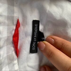 Tons of intrigue men’s collared shirt with a white and beige checkered print. In perfect condition with no flaws!
