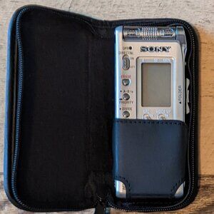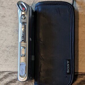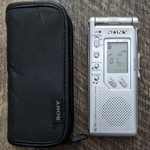 This is a silver Sony ICD-ST25 Digital Voice Recorder, which is included with a little black protective case with zipper closure. It is in excellent working condition. The dimensions are approximately 4” x 2” x 0.5”, and the last two images show measurements. PDFs of the manuals and operating instructions are available on the Sony website, which you can find by googling the name of the recorder. It uses two AAA batteries, which are not included in this listing. Made in Japan.