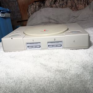 PS1 powers on but doesn't read the disc. It is missing the back cover slot and there's a crack in that corner. Also, the open button gets stuck and you have to manually push it back in place in order to close the lid.