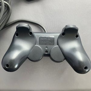 Sony PlayStation Game analog controller, SCPH-1200 w/ additional extension cord. Controller is is great shape, with just a small mark on the one joysticks. Extension cord is 75" long and attaches between the controller and the console.