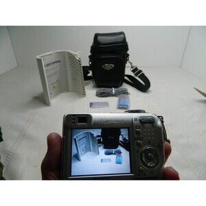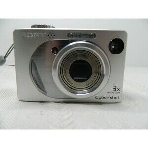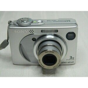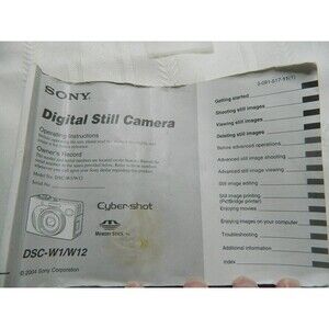 Compact Sony digital camera. Includes carrying case, manual, and cables. Ideal for photography enthusiasts.