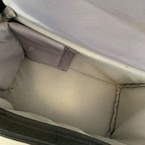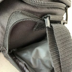 Small camera carrying case with four compartments and an adjustable strap