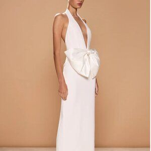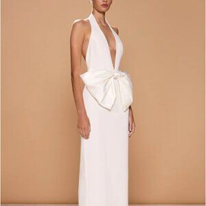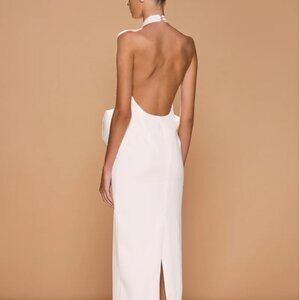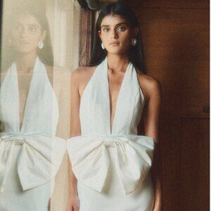 A showstopper, the Annique Dress features a scooped open back, low-plunging halter neckline, and an oversized bow at the front.