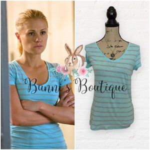 Sookie Stackhouse's OP Striped V Neck Tee. Size junior's medium, fits like a extra-small/small in women's. Exact match as the one worn on the show.