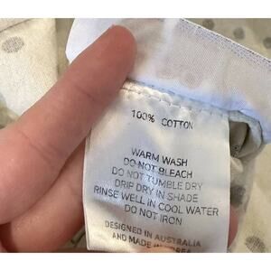 Elevate your maternity wardrobe with the Soon Maternity Hani V-Neck Maternity Blouse in a chic white polka dot pattern on a navy background. Made from 100% Cotton, this blouse offers a comfortable and breathable fit for all-day wear. Despite a small stain, it is still in very good condition.