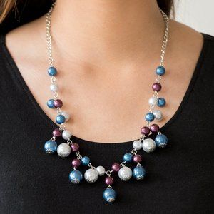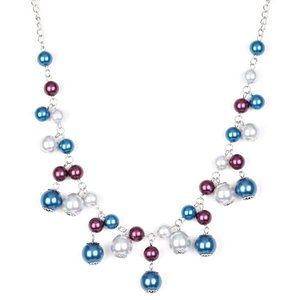 Varying in size, bubbly blue, purple, and silver pearls swing from the bottom of a classic strand of pearls, creating a refined fringe below the collar. Features an adjustable clasp closure.