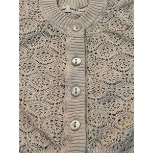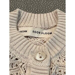 The Soor Ploom Tan Cardigan for unisex kids, sized 18/24M, is a luxurious cream-colored item in very good used condition. Made of soft Pima Cotton, it's perfect for keeping your toddler stylish and comfortable.