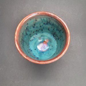 Artisan earthenware pottery bowl in stunning copper, brown, green, blue colors. This art pottery has a great pattern and beautiful glossy front finish. This item was unsigned and unfinished but comes from a known source.