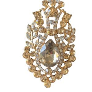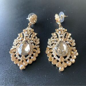 These elegant gold drop earrings add a touch of sophistication to any outfit. Perfect for special occasions or everyday wear. Dangle earrings, prom earrings, bridal, bridesmaid. Pierced. Antique gold, with light scratches/scuffs, on back of metal. clear & citrine colored crystals.