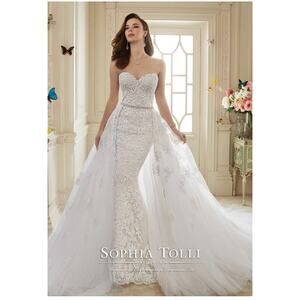 Make a grand entrance in Maeve, a two-piece lace and misty tulle wedding dress set that offers two bridal looks in one! The classic strapless sweetheart neckline is beautiful and flattering and adorned in beaded lace appliqués that cover the entire sheath silhouette. This style features Sophia Tolli's signature corset back, leading to a court length train. The detachable misty tulle overskirt instantly transforms the look into a faux ballgown, complete with a beaded belt to accentuate the waist and lace appliqués cascading towards the hem.