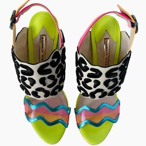 Keywords: Sophia Webster heels, Sophia Webster Dionne, multicolor sandals, statement heels, party shoes, leopard print shoes, neon heels, bold sandals, designer heels, summer statement shoes, cocktail party heels, runway-inspired sandals, festival fashion shoes, luxury playful heels