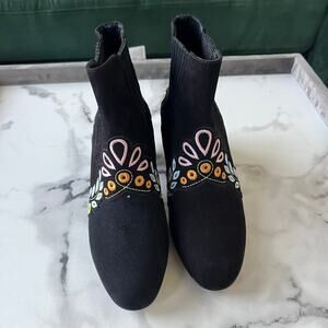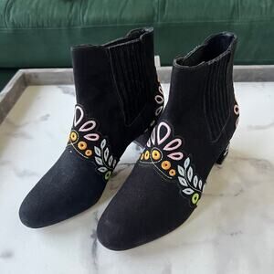 Sophia Webster 'Liliana' booties in black suede with multicolor embroidered detailing. Features an almond toe, stretch side gussets, and signature heart-stitched leather soles. Block 3" heel. Chic, playful, and crafted with Sophia Webster’s signature whimsy. Size EU 38.5 (fits US 8 best).