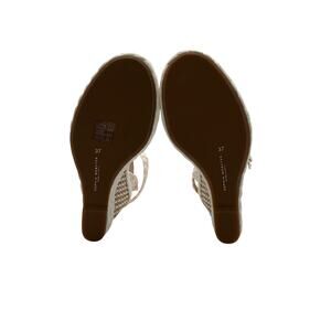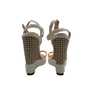 Sophia Webster 'Miranda' White Textile 140mm Wedge Sandals Size 37 EU / 7 US: designed with braided raffia straps, a woven wedge heel, open toe, adjustable buckle closure, textile upper, leather lining, synthetic sole.