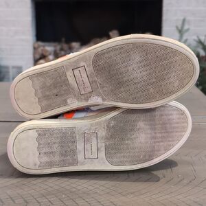 In fair condition. The outsoles are discolored. The glitter panel has separated under the orange trim on left shoe