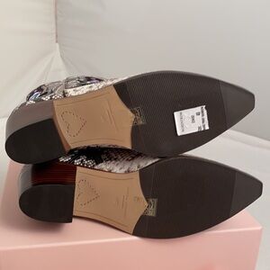 Sophia Webster Shelby western style leather pointed toe boots. Essential cool funky designer style featuring black and white snakeskin embossed finish and signature butterfly detail accents. The rainbow butterflies give that fun pop of color. Side zip closure with rose gold pull make for easy on and off. Leather lining gives a luxurious feel. Leather and rubber sole. 2” block heel. Other measurements in photos. New in box with dust cover. Will go to poshmark 1st for authentication then on to you. New in box- No flaws. I had to have them but I don’t have anywhere to wear them and can’t justify keeping them! Smoke free home.