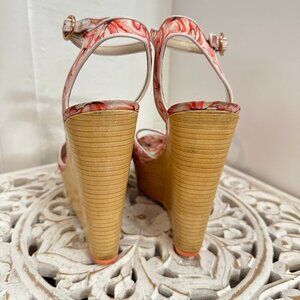 Sophia Webster flamingo printed satin fabric with white leather piping heels with wood stacked platform heels