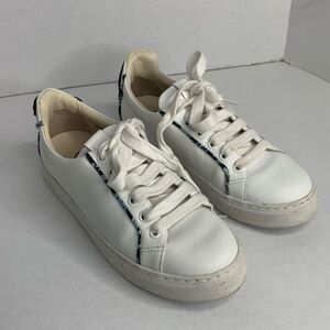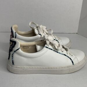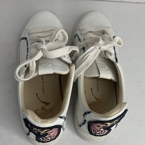 Sophia Webster low top buffed white leather trainers sneakers. Lace-up closure and padded tongue and collar. Butterfly appliqué at heel counter with matching fabric trim. Textured rubber sole. Excellent condition