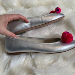 Super cute silver flats with Pom poms on the front by Sophia Webster. Excellent preowned condition with only slight wear on soles and insoles as shown and one scuff on exterior as shown. Worn once. Size 38