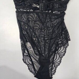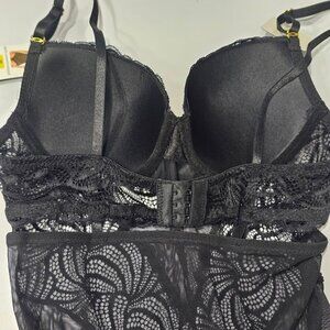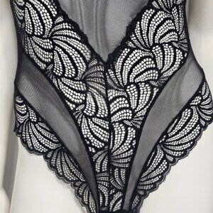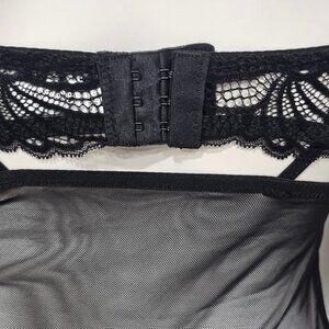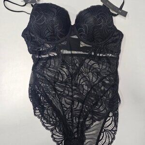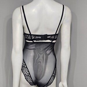 Lightly Padded with Underwire. Sheer center with black lace. Snap crotch , Adjustable straps . Hook & Eye closure.