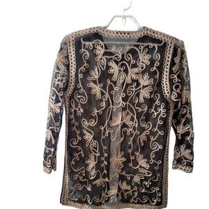 Sophie Chang Studio kimono top womens 1X ? black gold applique mesh Holi…