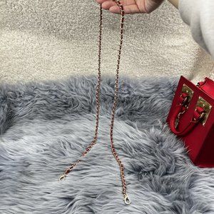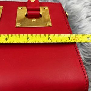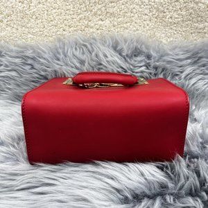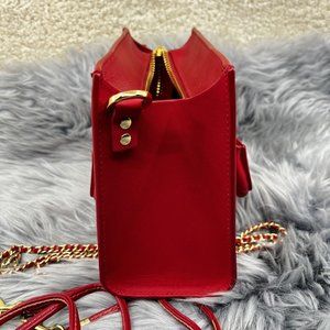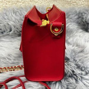 Elegant red tote with signature gold hardware. Includes detachable strap. Perfect for any occasion.