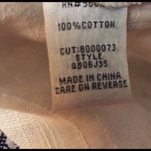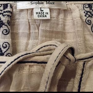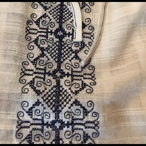 22.5 inch bust, 25 inch length front, 26 inch length back. Slightly longer in back. Soft linen look peasant top in 100% pattern cotton embroidered in navy. You can wear the tie closed or wear it open for a sexier look !