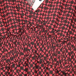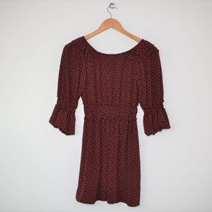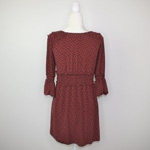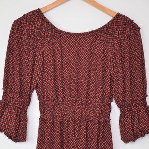 Brick red and dark brown geo flower pattern. Deep surplice v-neckline, smocked elasticized empire waist.