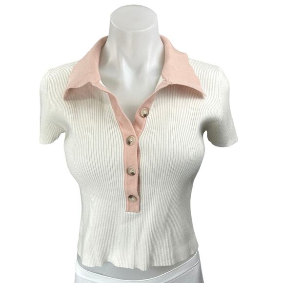 Sophie Rue White Pink Rib Knit Button Collar Short Sleeve Crop Polo Blouse Top M