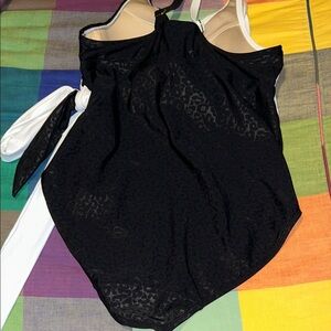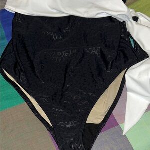 Elegant one piece with a striking black and white design. Perfect for a stylish beach day.