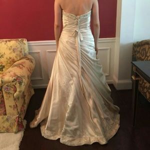 Gorgeous cream gown with beaded trim, knife-pleated bottom, and corset back. Used once, so it needs only a few minor touchups. Comes with a little extra fabric and beaded trim, if you would like to use it for alterations.