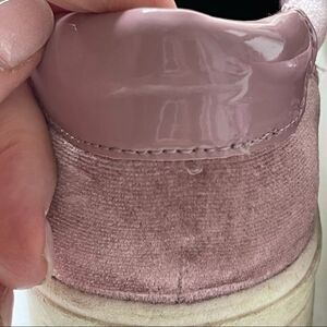 What I Love About It: That velvet! Beautiful rose colored velvet on top of a platform base. Patent leather heal guards in matching rose color. One of a kind!