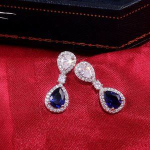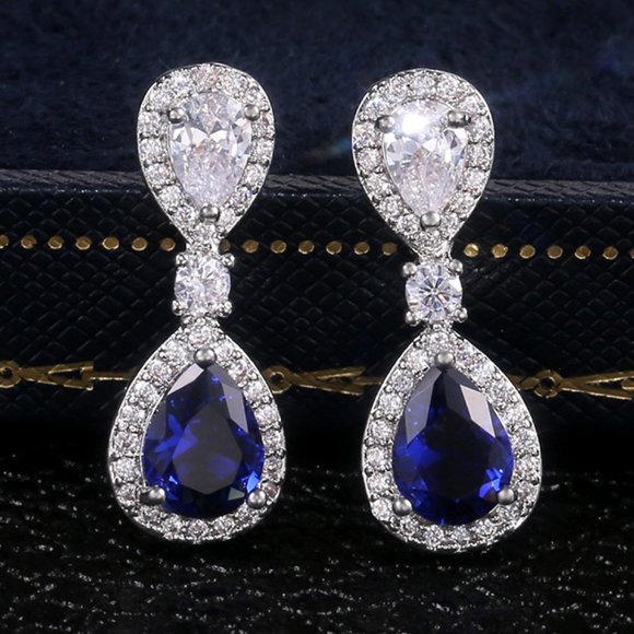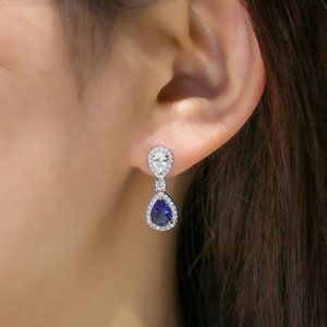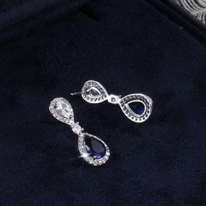These exquisite earrings showcase a two-tier design with a deep blue teardrop crystal, elegantly framed by shimmering silver accents. The intricate detailing and luxurious appearance make them ideal for special occasions.