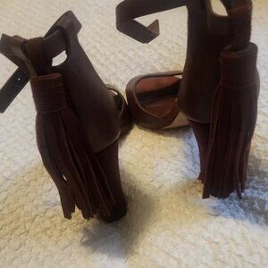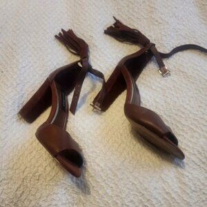 Super cute tassles in the back!These brown high heels feature a classic pump style with a pointed toe and a slender 3-4 inch heel, offering a sleek and timeless silhouette. The rich suede material adds a touch of luxury, while the ankle strap provides both style and support, making them perfect for formal events.